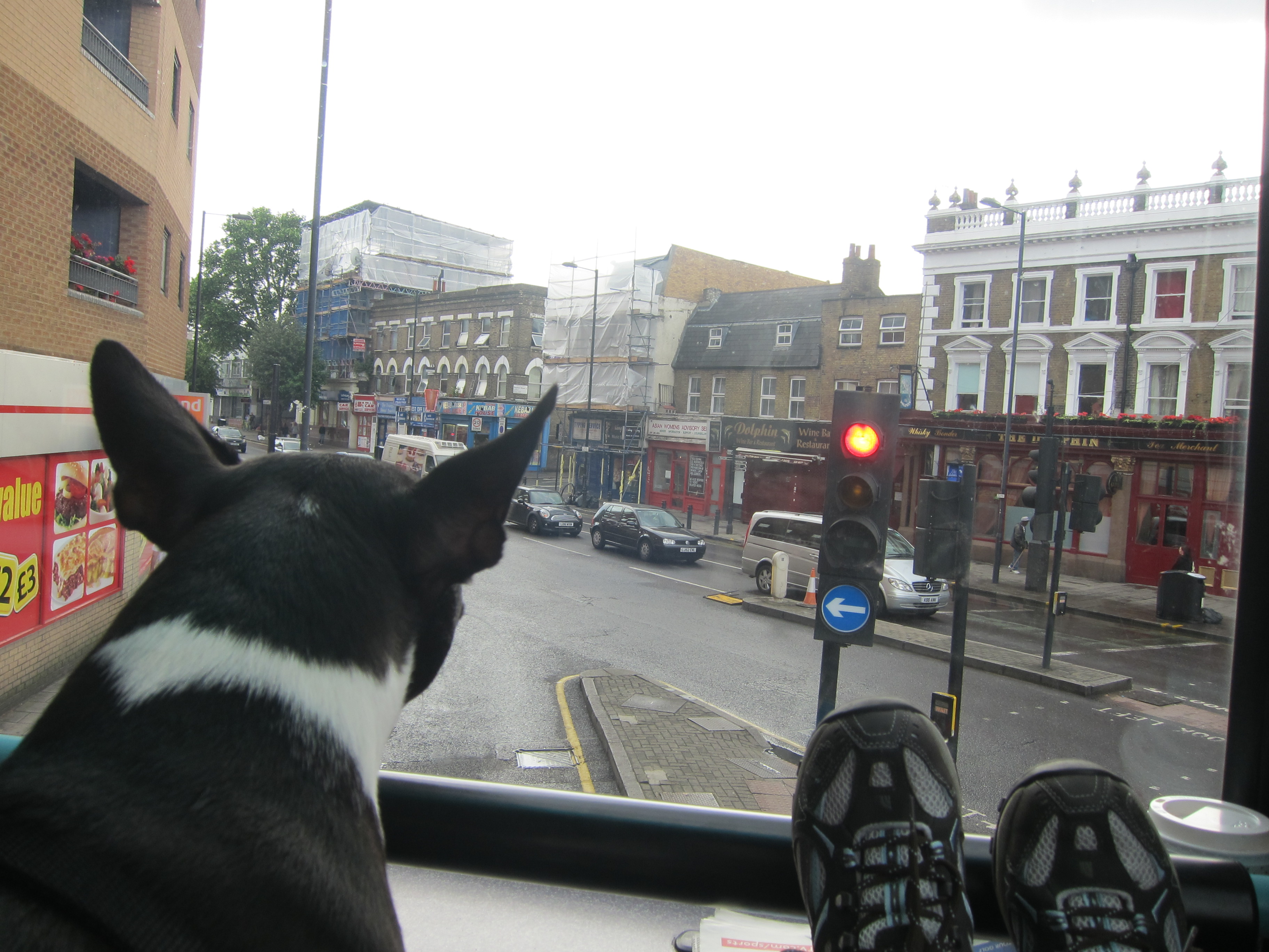 On our last day in London, we decided to walk around Hoxton to see some of the street art. Here are some pics! The first one is a Banksy that has some graffiti over it, but the wall has been white-washed around it. That was pretty cool to see. I love the little blue guy showering in the window of the abandoned building too. There is so much street art just around the city. It is really neat to see pieces by the same person all over. They all have really unique characters…I also loved the picture of Beasley on the double decker bus we were on. He loved riding on the top of these and watching out the window.